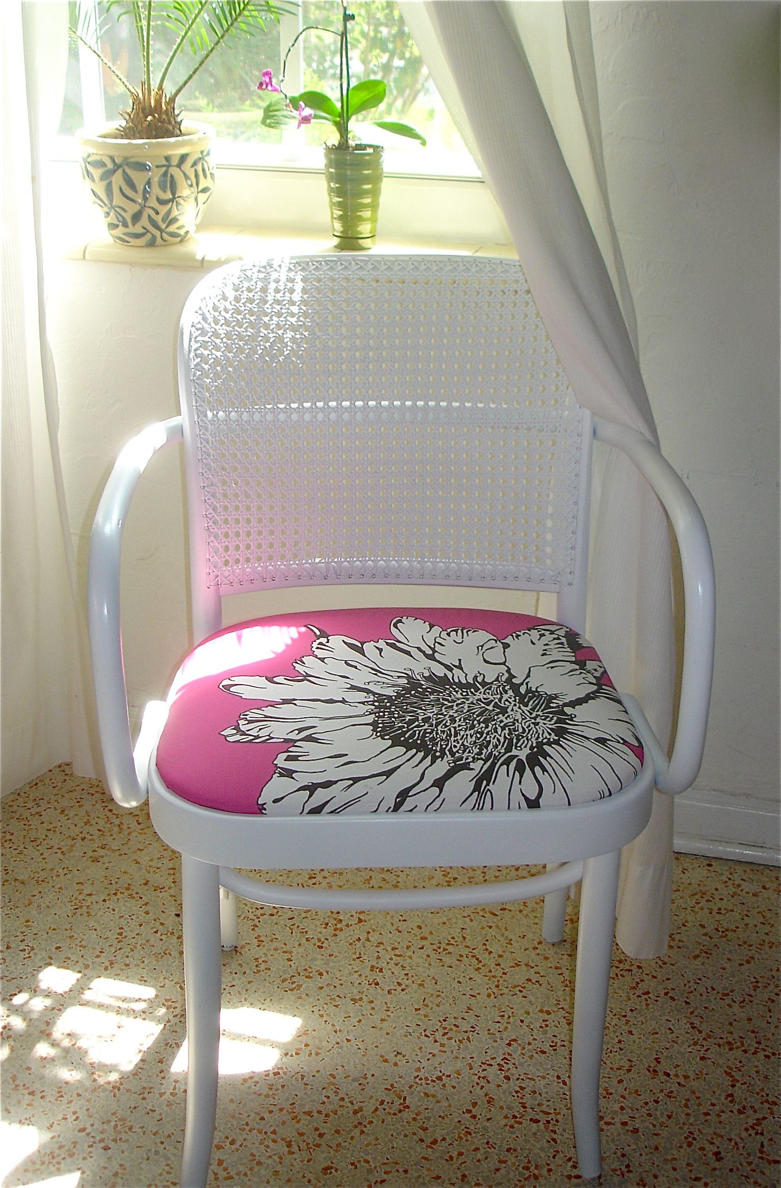 A salvaged Czeckoslovakian Drevounia chair, freshly painted white and upholstered in Nighflower fabric, a unique design available on Spoonflower here: http://www.spoonflower.com/profiles/brownwilliam_llc
